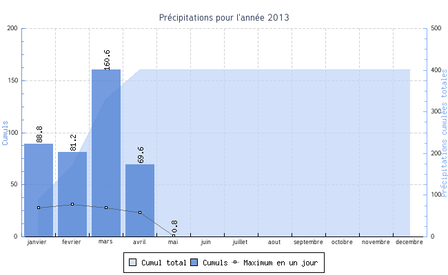 | janvier | -0.3 °C | 3.4 °C | 18.5 °C | 13.4 °C | 8.0 °C | 2.0 km/h | 69.2 km/h | E |