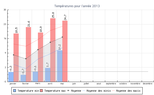 | Mois | Températures min | Températures max | Moyenne mensuelle |