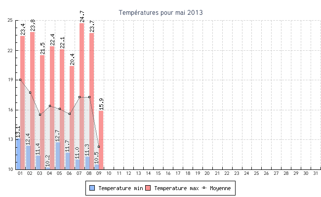 | 09 | 10.5 °C | 15.9 °C | 12.3 °C | 0.1 km/h (4.8 km/h) | E |